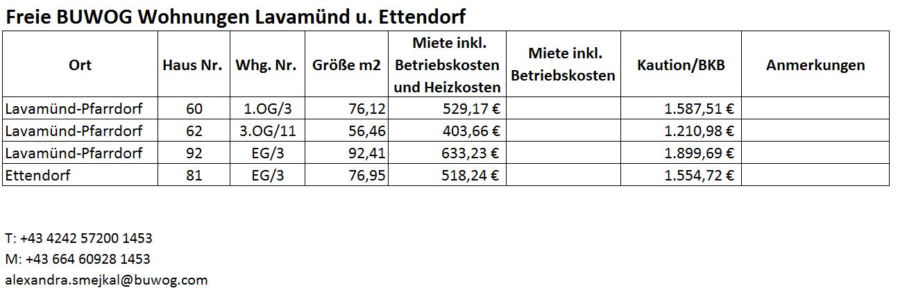 Bei Interesse an einer BUWOG- oder Gemeindewohnung in der Marktgemeinde Lavamünd ersuchen wir Sie, das entsprechende Wohnungsansuchen vollständig auszufüllen und entweder persönlich im Gemeindeamt abzugeben oder per E-Mail an lavamuend@ktn.gde.at zu übermitteln.