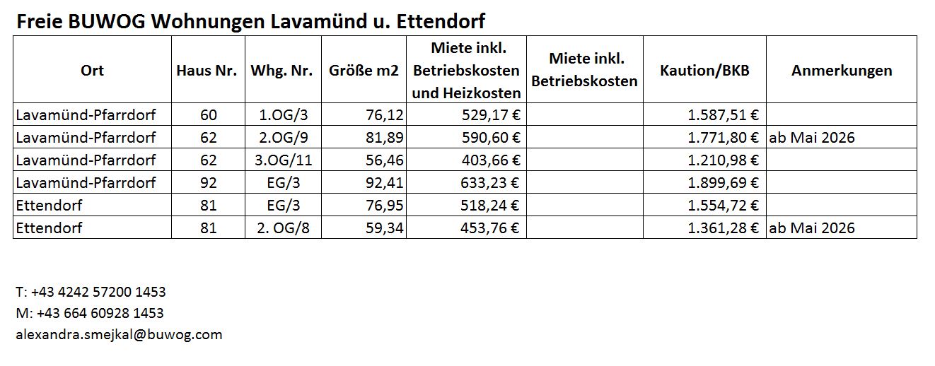 Die Marktgemeinde Lavamünd hat selbst ca. 100 Gemeindewohnungen und hat ein Wohnungszuweisungsrecht für die BUWOG-Wohnungen in Lavamünd und Ettendorf.