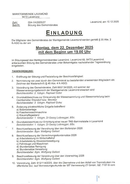 Die nächste Sitzung des Gemeinderates der Marktgemeinde Lavamünd findet am Montag, dem 22. Dezember 2025 statt. Die Sitzung ist öffentlich (bis auf den Punkt Personalangelegenheiten).
