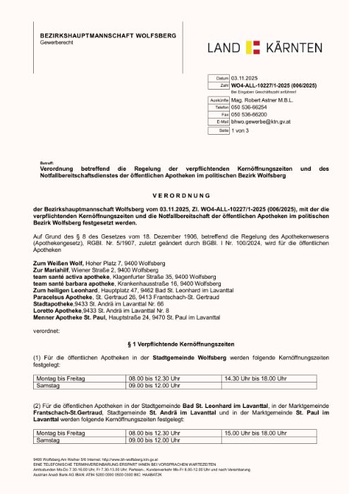 Kernöffnungszeiten und Notfallbereitschaftsdienst der Apotheken im Bez. Wolfsberg