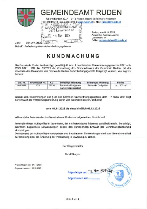Kundmachung Aufhebung eines Aufschließungsgebietes der Gemeinde Ruden