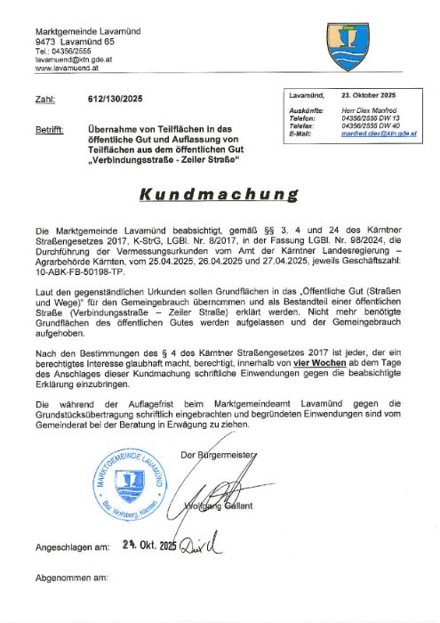 Kundmachung Auflassung und Übernahme öffentliches Gut – Zeiler Straße