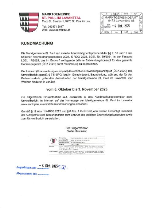 Kundmachung Gemeinde St. Paul – 2. Auflage örtliches Entwicklungskonzept