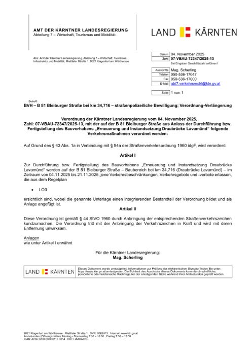 Verordnung Straßenpolizeiliche Bewilligung – Sanierung Draubrücke