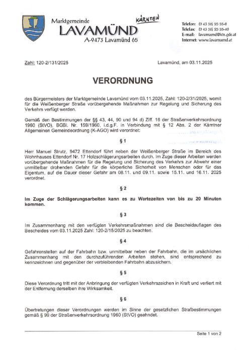 Verordnung StVO – Holzschlägerung Weißenberger Straße
