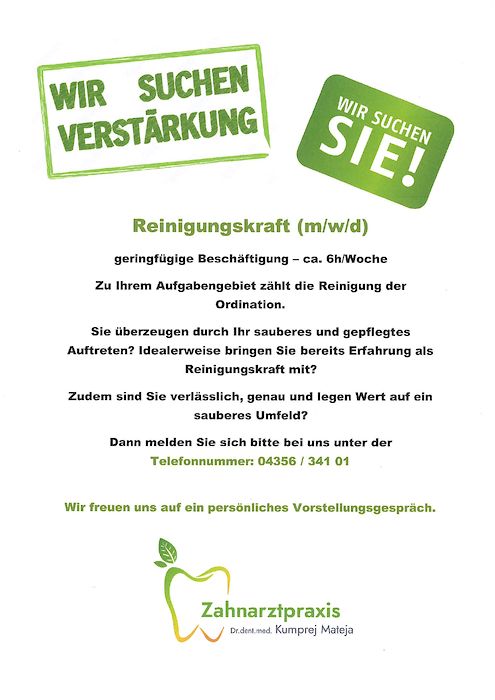 Die Zahnarztpraxis von Dr. dent. med. Mateja Kumprej in Lavamünd sucht eine Reinigungskraft (m/w/d) für eine geringfügige Beschäftigung (ca. 6 Stunden pro Woche).