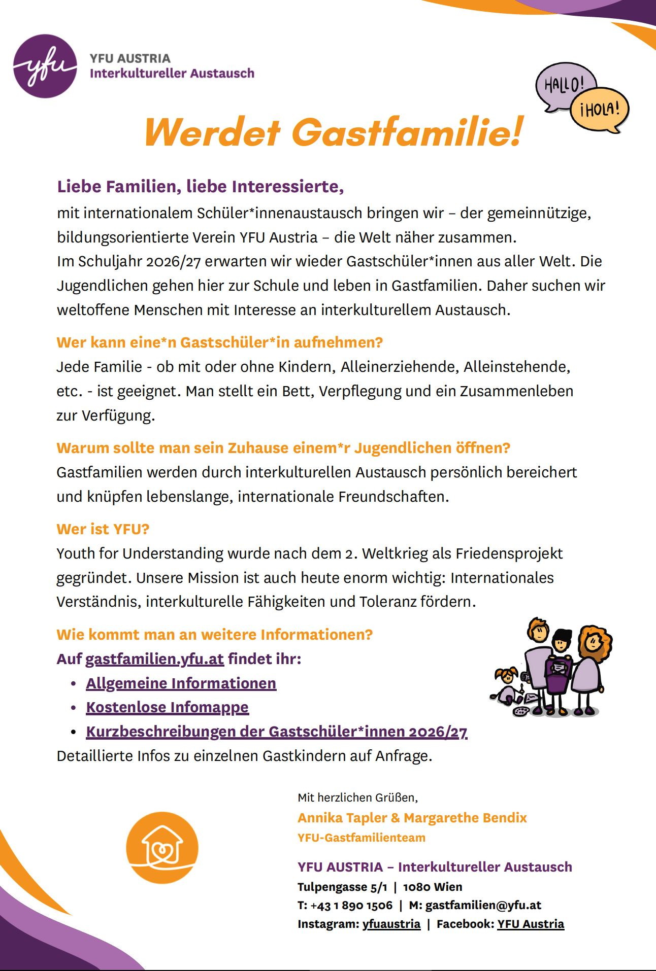 🚸 Unter gastfamilien.yfu.at können Sie mehr über unser Gastfamilienprogramm erfahren. YFU (“Youth for Understanding”) wurde nach dem 2. Weltkrieg gegründet, um zu mehr interkulturellem Verständnis und Toleranz beizutragen. Es werden Gastfamilien gesucht! 😃